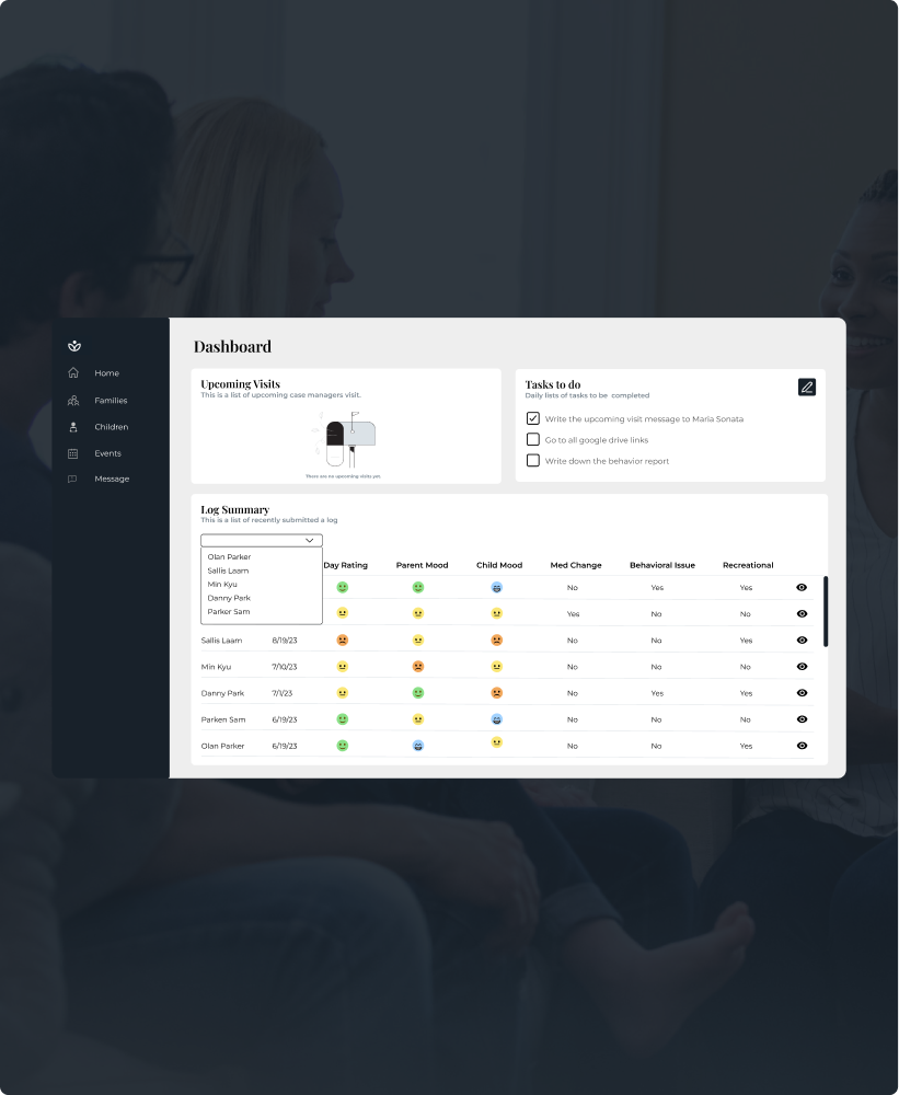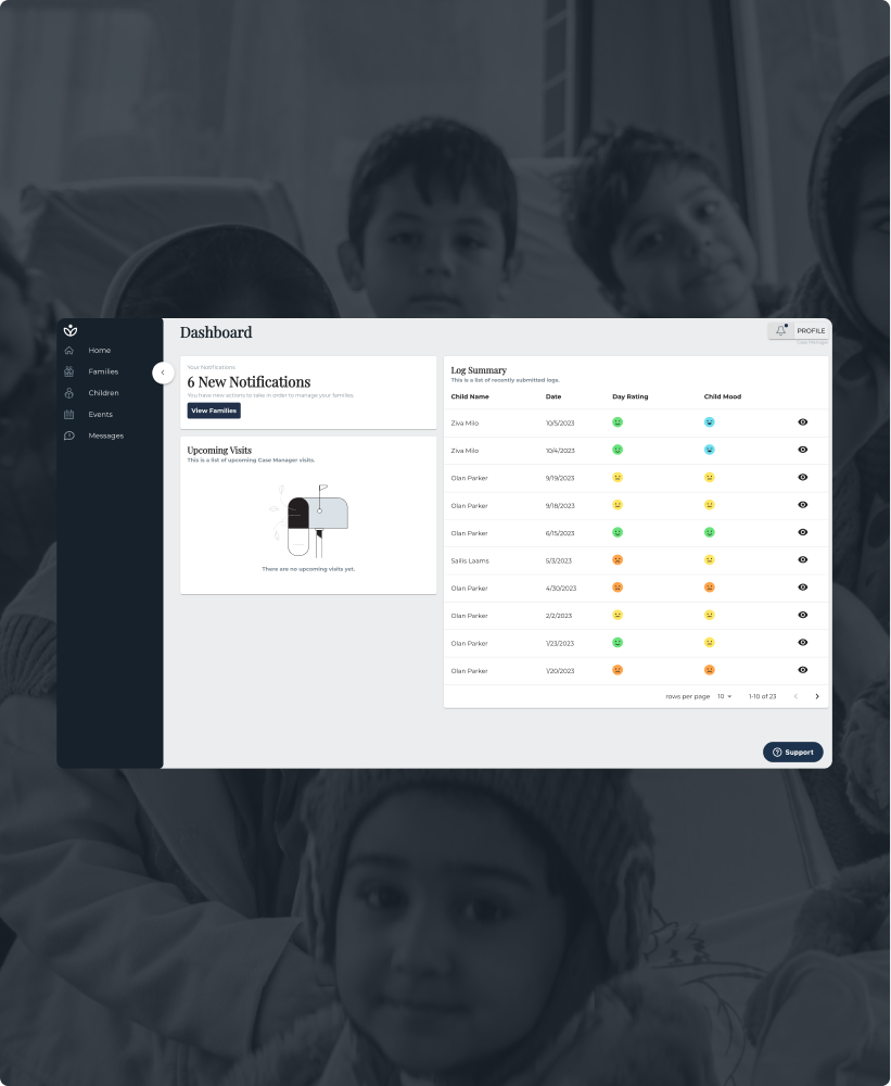 The dashboard shows a personalized profile for each child, helping case managers quickly track their well-being. It brings together information like foster parent reports, medical records, and behavior updates in one place.